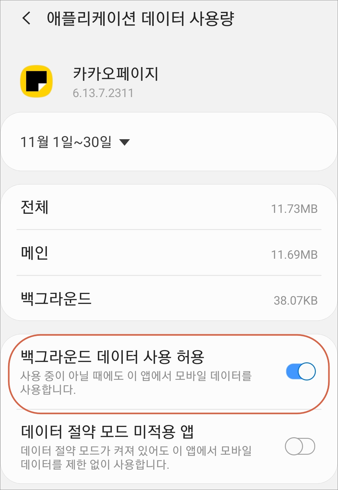 △ 그리고 애플리케이션 정보에서 모바일 데이터에서 백그라운드 데이터 사용 허용을 활성화시켜주시면 됩니다.