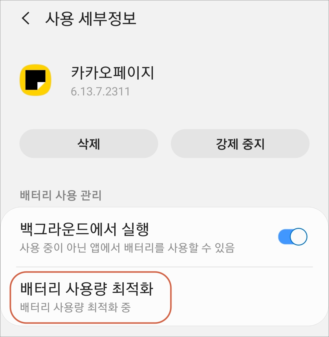 △ 설정 앱에서 애플리케이션에 들어갑니다. 카카오페이지 앱을 선택하고 배터리를 터치해보면 사용 세부 정보화면이 나옵니다. 여기서 배터리 사용량 최적화에 들어가서 카카오페이지 앱을 제외시켜주면 됩니다.