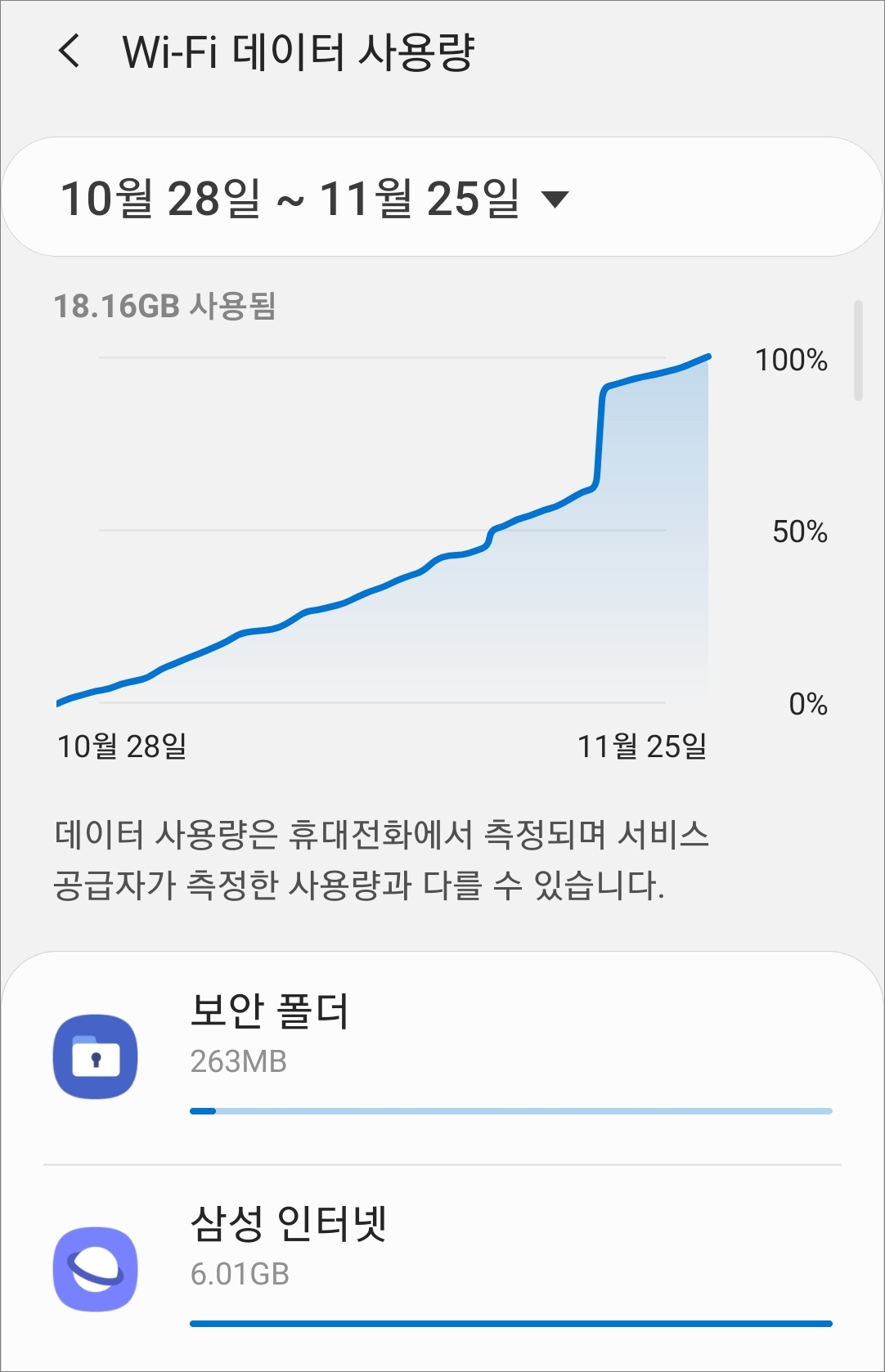 ▶ 데이터 사용 화면에서 맨 아래쪽에 보시면 와이파이 데이터 사용량을 확인해볼 수 있죠. 대략 한 달 정도의 기간 동안 얼마의 데이터를 사용했는지 알아볼 수 있습니다. 개인적으로 18GB 정도 사용했네요.