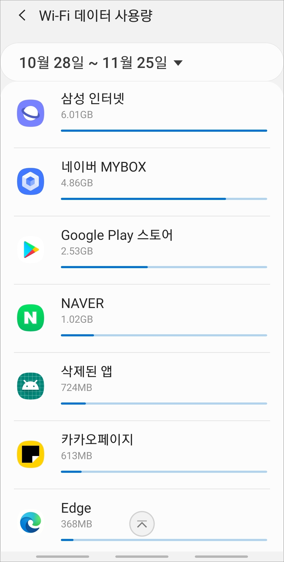 대부분 집에서 사용한 와이파이 데이터지만 본인이 주로 어떤 앱에서 데이터를 사용했는지 확인해볼 수 있겠죠. 그냥 재미로 확인해본다고 보면 될 듯하네요.