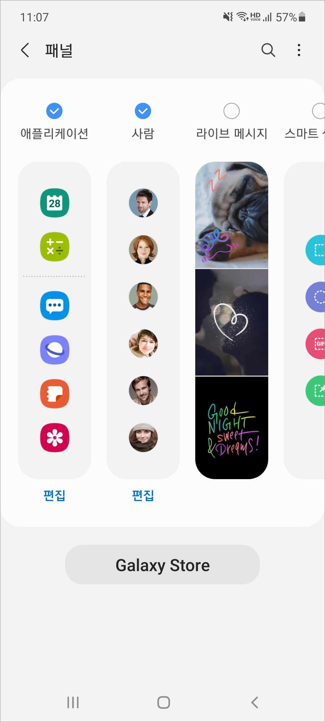 △패널에서는 애플리케이션, 사람, 라이브메시지, 스마트 셀렉트, Tasks, 날씨, 도구, Music, 리마인더, 클립보드 등 다양하게 패널을 추가해줄 수 있습니다. 더 다양한 패널을 보고자 한다면 화면 아래 Galaxy Store에 들어가 봅니다.