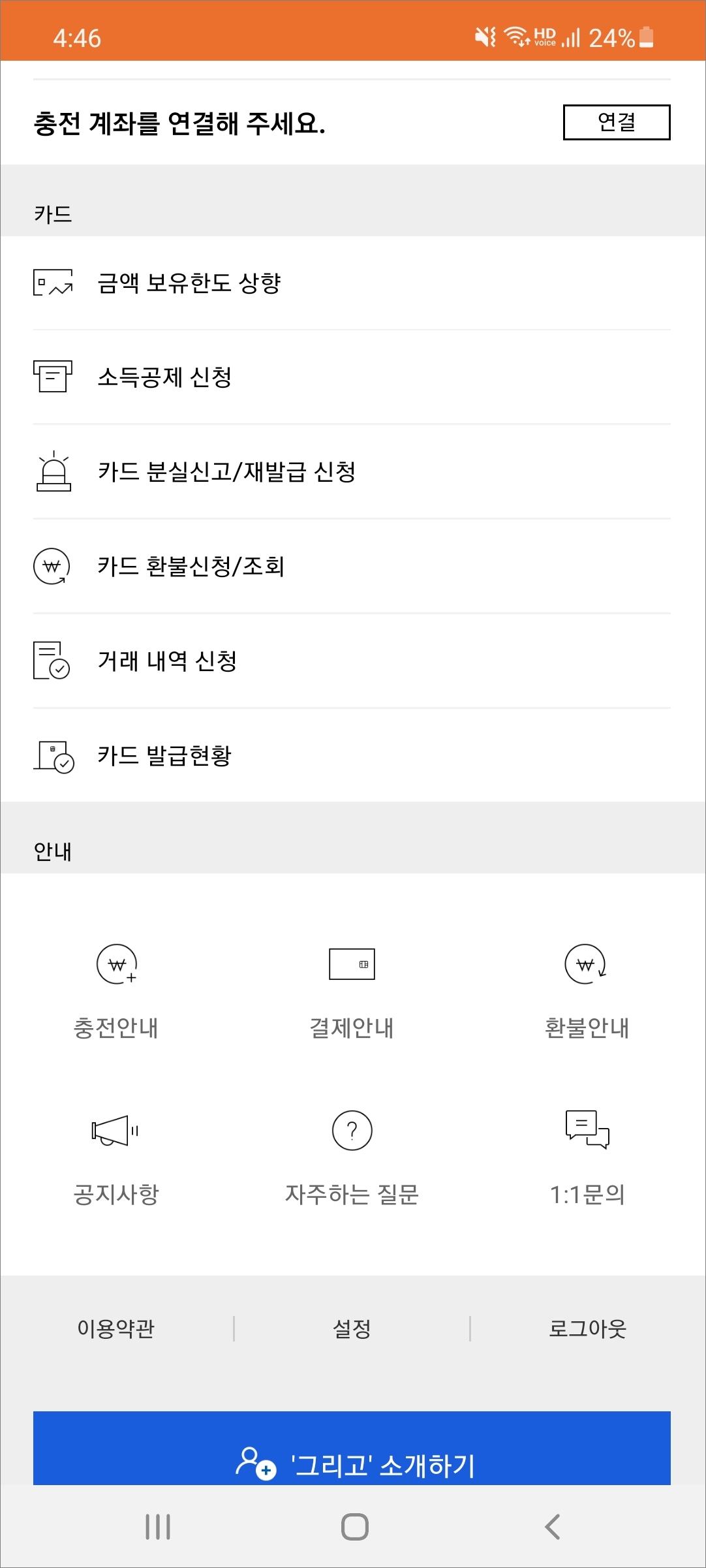 ▲홈 화면 오른쪽 위에 있는 삼선 모양을 터치해보면 금액 보유한도 상향과 소득공제 신청을 해줄 수 있습니다. 그리고 환불신청도 물론이고 내역 등도 확인해볼 수 있습니다. 안내에서는 충전안내/결제안내/환불안내 등이 있으니 참고해서 읽어보시면 되겠습니다.