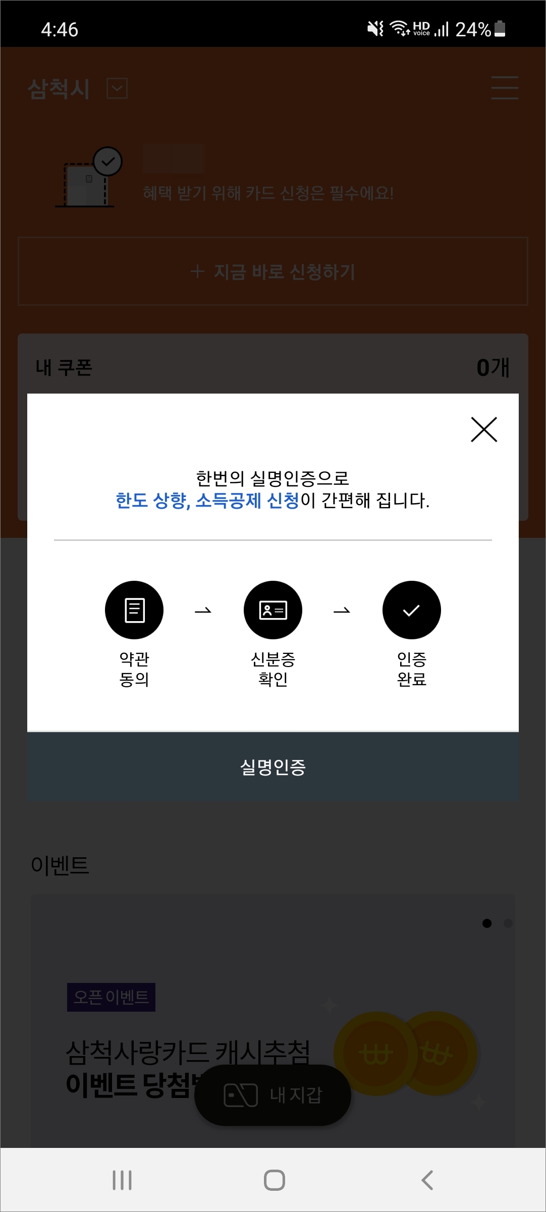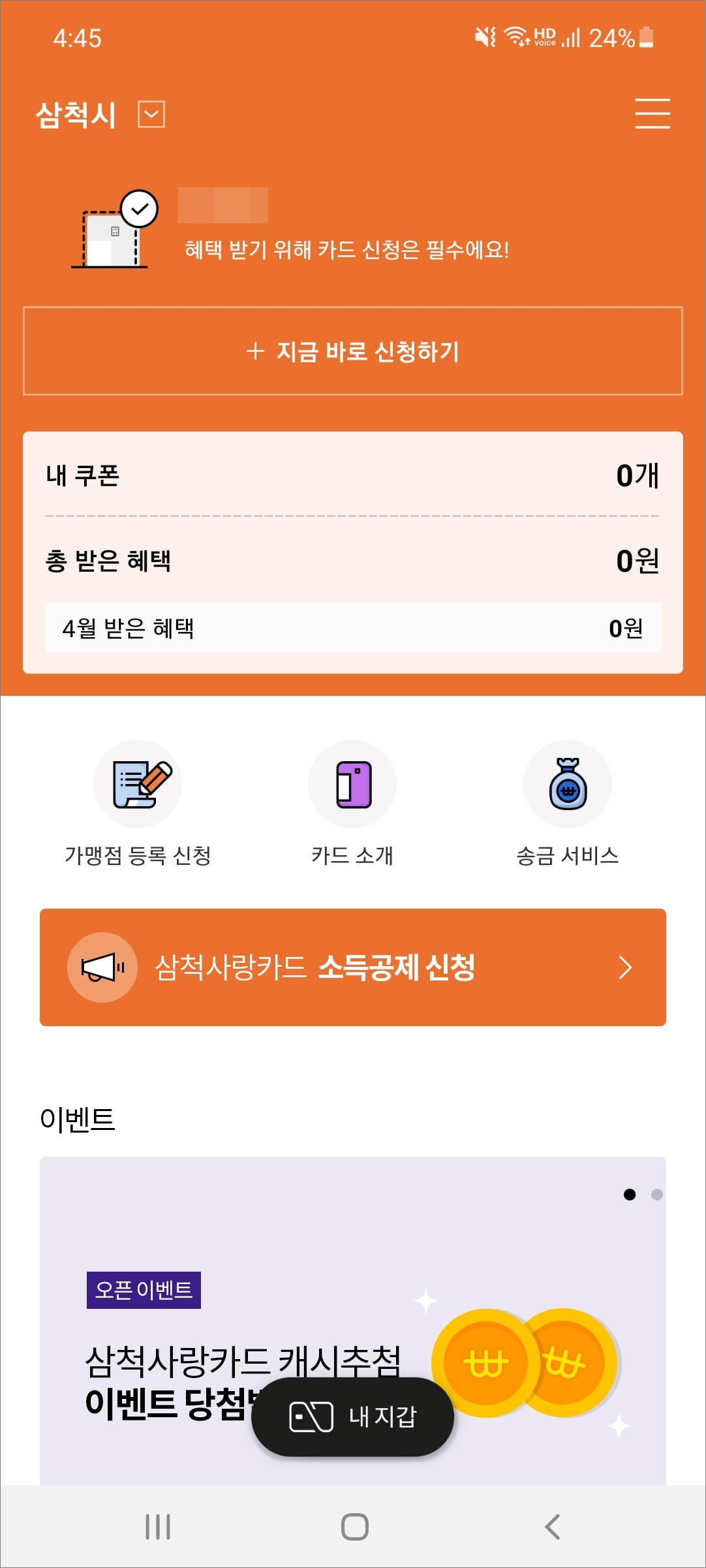 ▲지역을 삼척시로 선택하고 홈 화면을 보시면 상단에 카드 신청하기를 바로 이용할 수 있고 화면 아래 내 지갑에서 카드 등록을 해줄 수 있습니다. 가맹점 등록 신청도 앱에서 해줄 수 있네요.