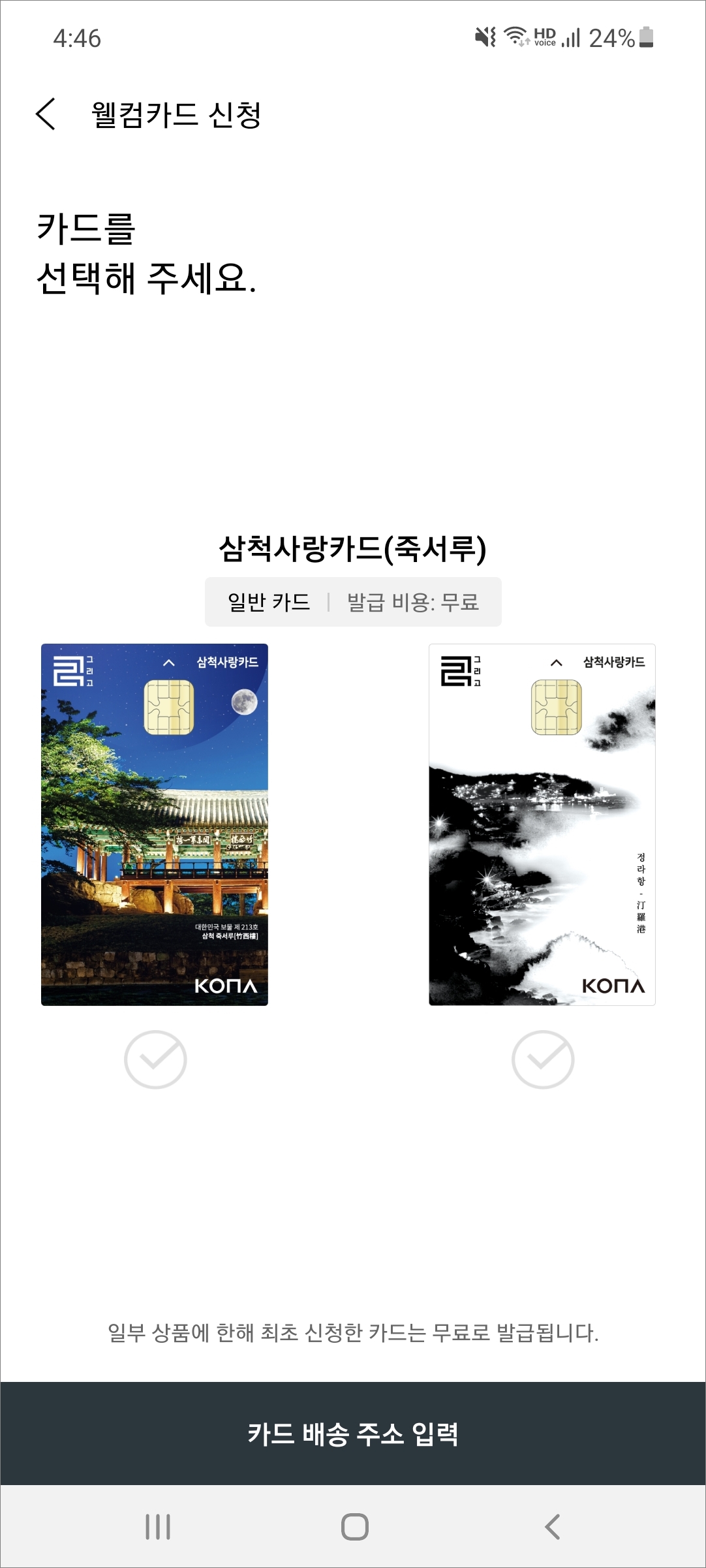 ▲카드 신청에서 죽서루/정라항 중 카드 선택을 하고 화면 아래 배송주소 입력해주면 됩니다.